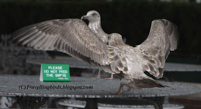 Esta foto es genial; las gaviotas se estaban poniendo moradas a patatas fritas... Aquí podemos ver con detalle el diseño alar y las infra y supra caudales típicas. Llamativas son las secundarias uniformes y oscuras, contrastando con las algo más claras y también uniformes grandes cobertoras.