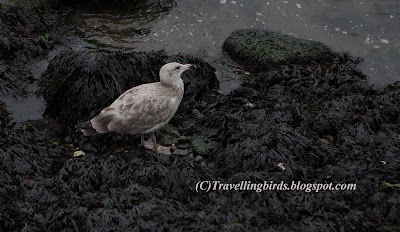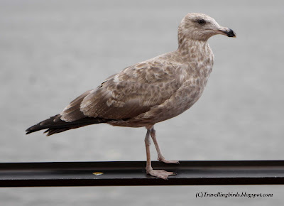 Aquí vemos una foto muy parecida a la primera, pero de un ave de 2º invierno. Llama la atención por su aspecto "nebuloso", con esas escapulares de amplios centros marrones y bordes pálidos. las cobertoras alares son uniformemente oscuras, y vemos las primarias en plena muda.