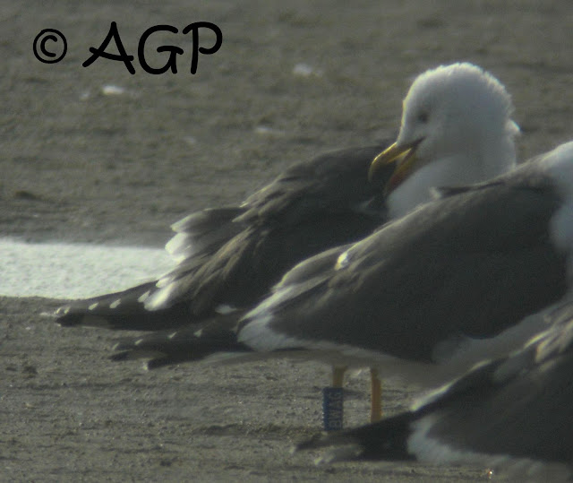 Vemos a BLANCO 0.U4 con la Larus cachinnans, invernante en la zona (lástima de luz.....)