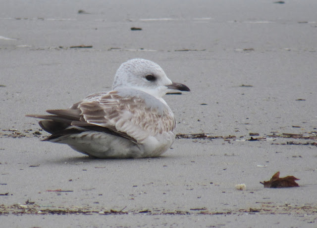 En Nemiña nos encontramos con numerosas gaviotas cabecinegras (Larus melanocephalus). Y con cuatro gaviotas canas (Larus canus), todas de 1° invierno como el individuo de la fotografía.
