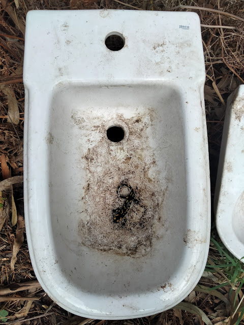 Por el camino, una guarrada más de algún desaprensivo que quiso montar su cuarto de baño en medio del monte.... León, que lo ve todo, nos avisa de que hay una Salamandra (Salamandra salamandra) en el lavabo....